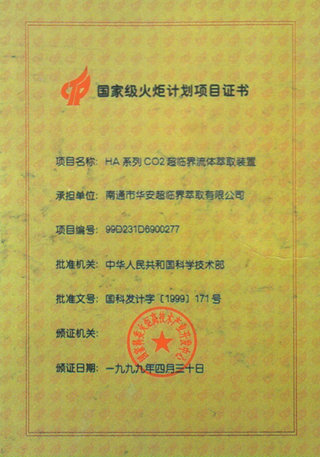 火炬計(jì)劃項(xiàng)目證書(shū)